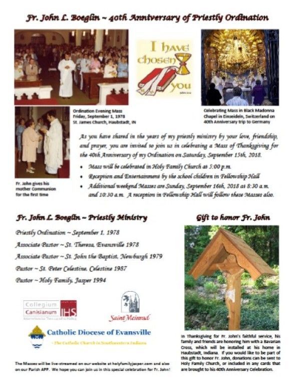 Our pastor, Fr. John Boeglin, is celebrating the 40th Anniversary of his priestly ordination on Saturday, September 15th at the 5:00 p.m. Mass. We invite you to join us for this special Mass, along with the reception following in our Fellowship Hall. Additional Masses are Sunday, September 16th at 8:30 a.m. and 10:30 a.m. A reception will follow these Masses also. All Masses will be live-streamed on our website and Parish APP. We hope you can join us for this special celebration in thanksgiving for the blessing of Fr. John!