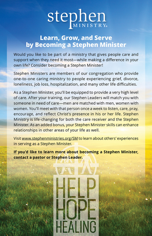 - If you are a compassionate person and a good listener, prayerfully consider becoming a Stephen Minister.
