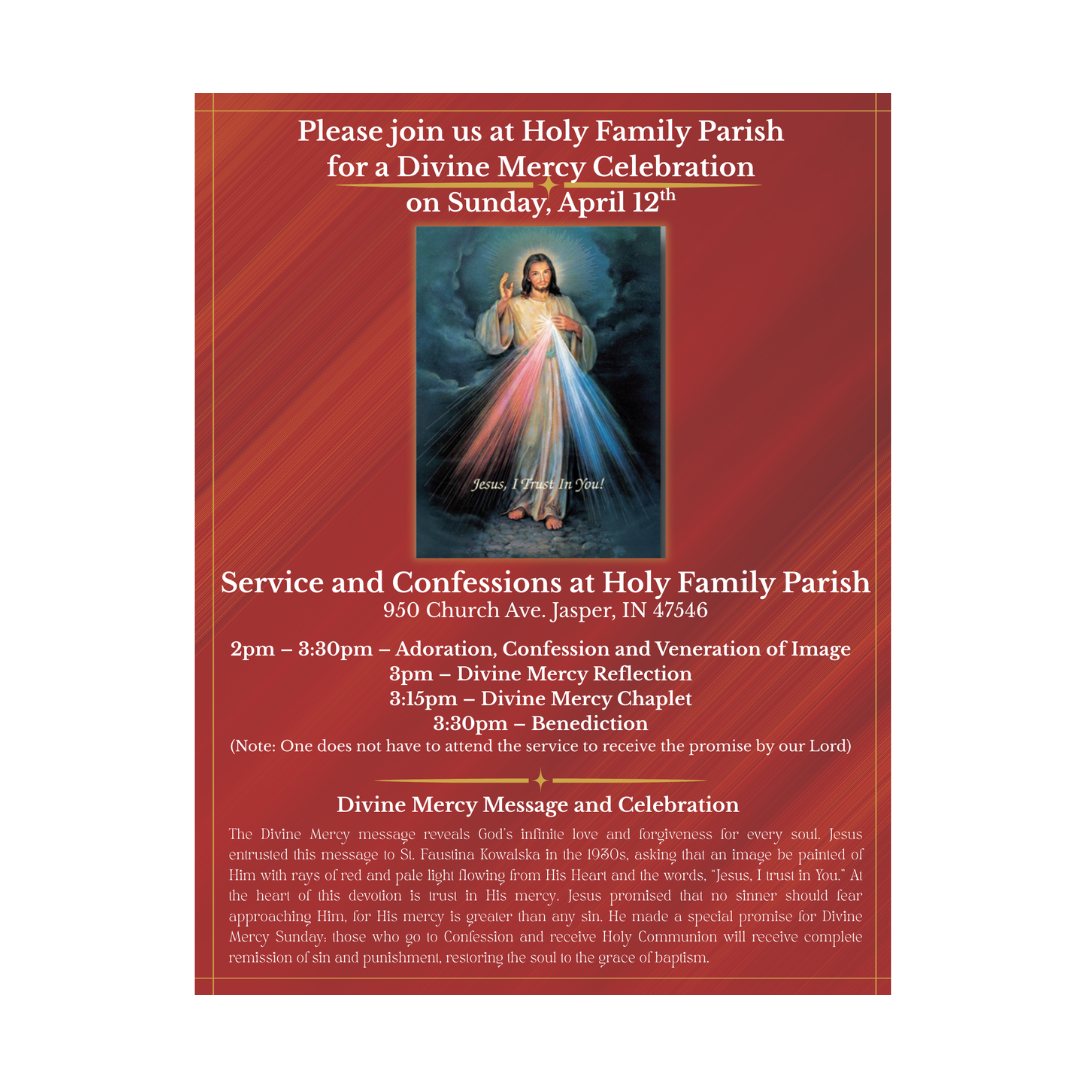 The Divine Mercy message reveals God’s infinite love and forgiveness for every soul. Jesus entrusted this message to St. Faustina Kowalska in the 1930s, asking that an image be painted of Him with rays of red and pale light flowing from His Heart and the words, “Jesus, I trust in You.” At the heart of this devotion is trust in His mercy. Jesus promised that no sinner should fear approaching Him, for His mercy is greater than any sin. He made a special promise for Divine Mercy Sunday: those who go to Confession and receive Holy Communion will receive complete remission of sin and punishment, restoring the soul to the grace of baptism.