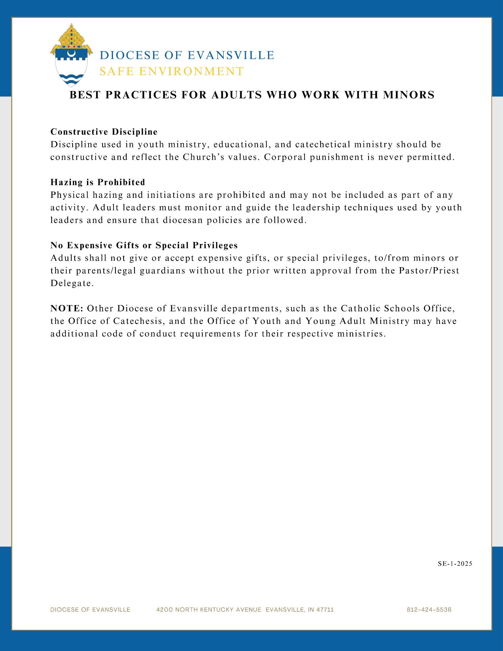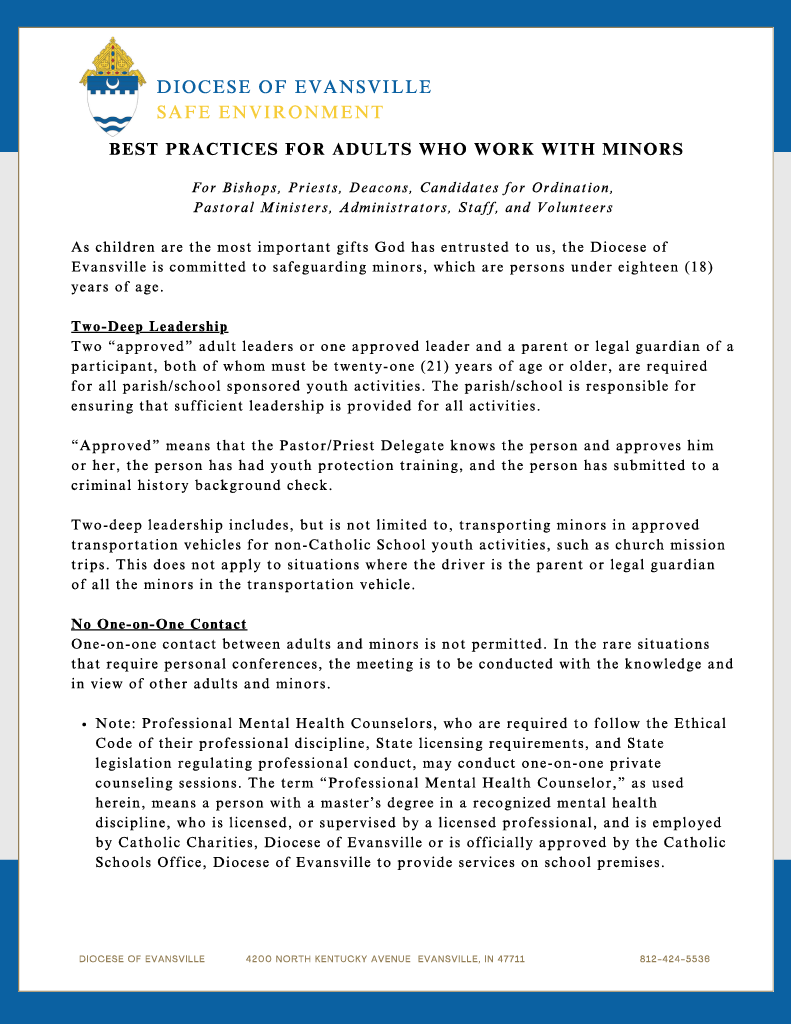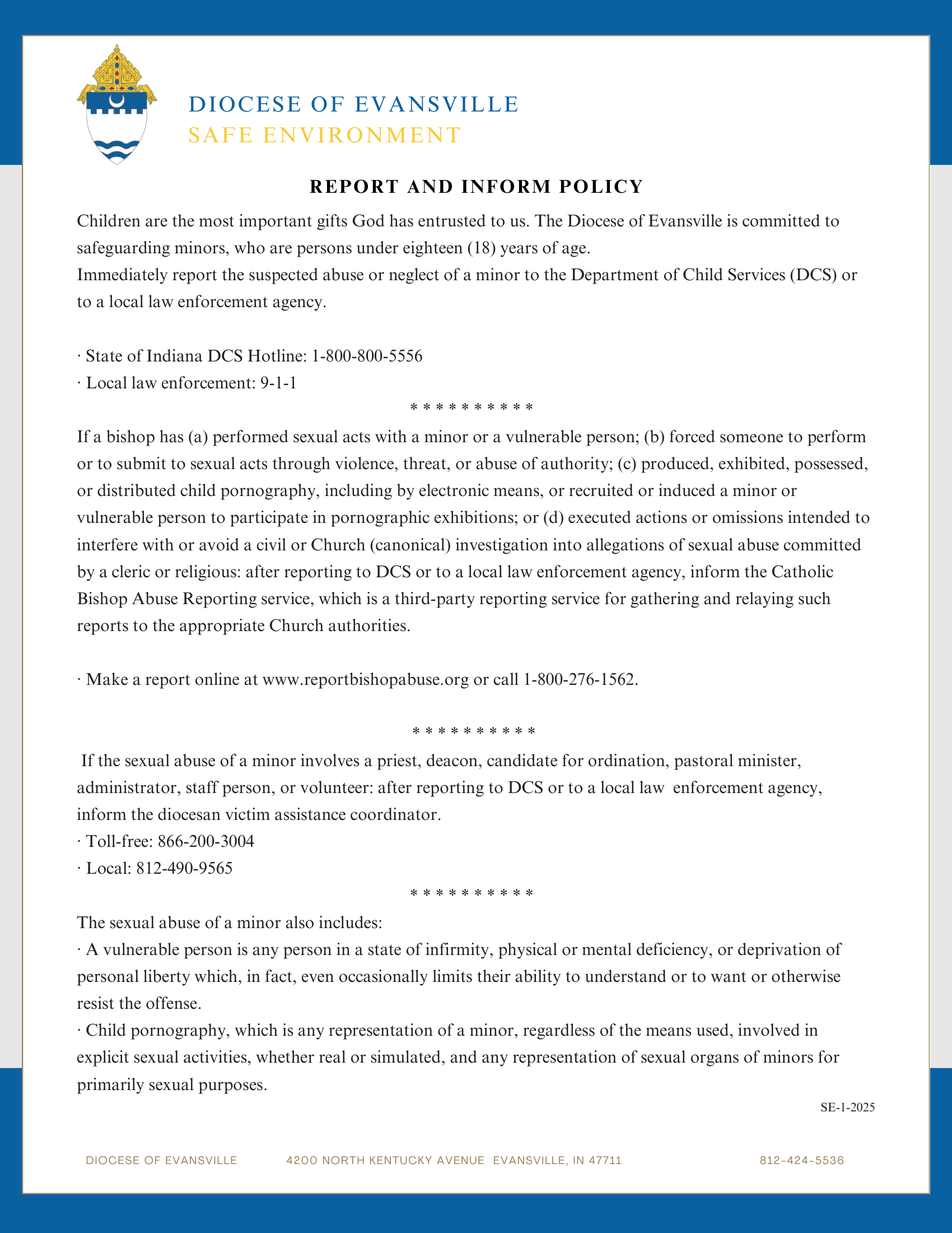 If the sexual abuse of a minor or vulnerable adult involves a priest, deacon, candidate for ordination, pastoral minister, administrator, staff person or volunteer of the Diocese of Evansville, also contact the Victim Assistance Line at the number listed on the Report and Inform Policy.